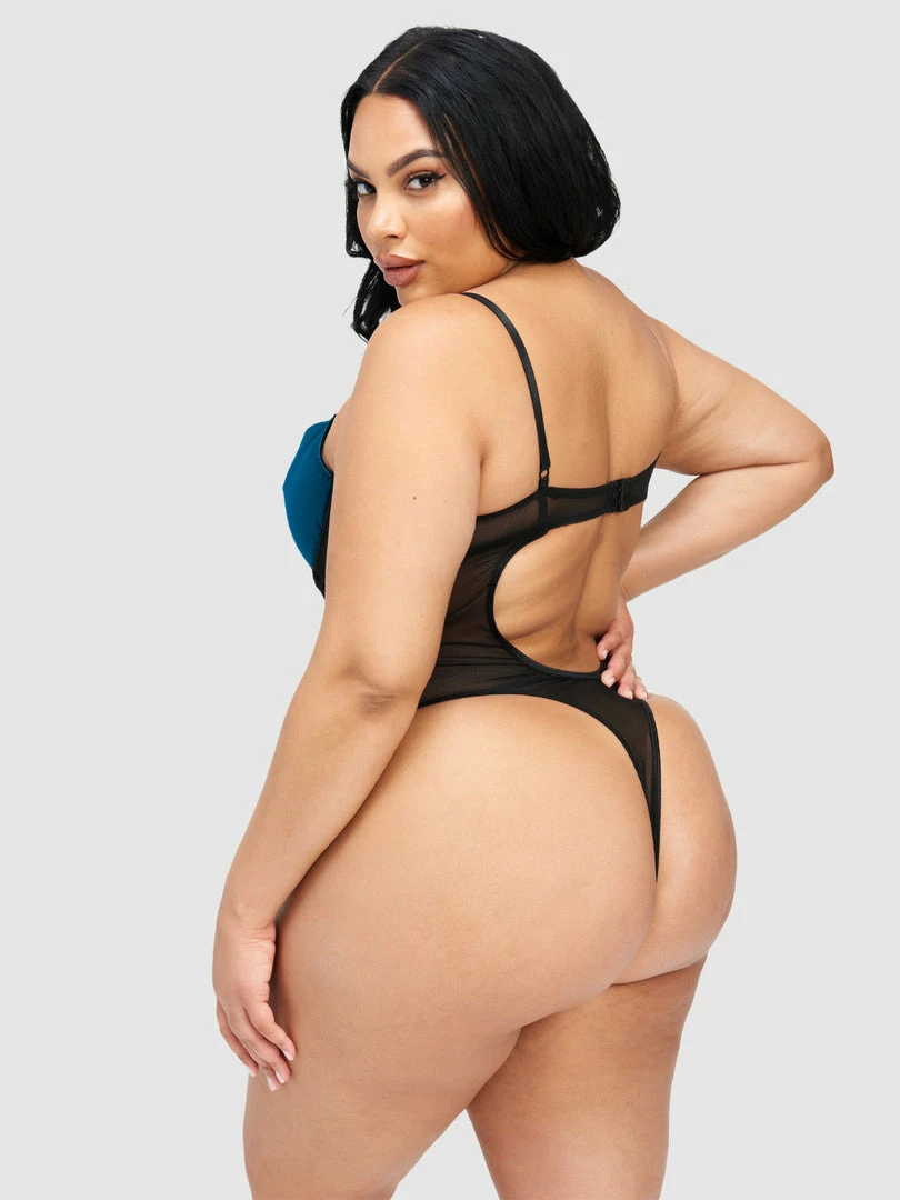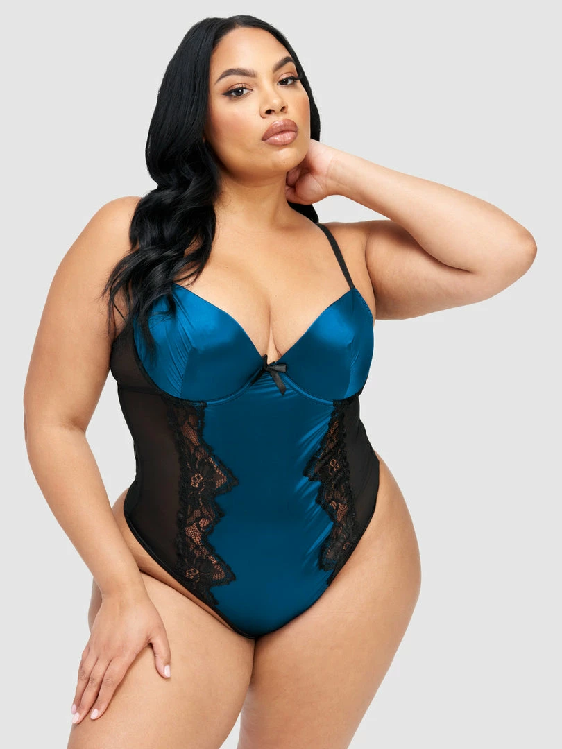 Made with satin and contrasting mesh panels, this teddy flatters your bust with underwired cups, delicate floral lace trim, and a bow at the center front. Finished with adjustable straps, hook and eye closures, and a cheeky thong back – Beatrice seduces with just one look.