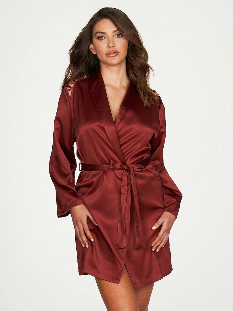 Alluring and sophisticated, the Summer Lace Robe from Frederick’s of Hollywood is the perfect addition to your loungewear collection. This sleep set is crafted with the softest satin and is designed with a fashion forward cross-over strap shoulder detail, provocatively revealing your skin beneath. Crafted with a double-faced satin ribbon designed to be worn tied at the waist or worn open. Pair with the Summer Lattice Lacing Babydoll or Sleep Set to complete the look.