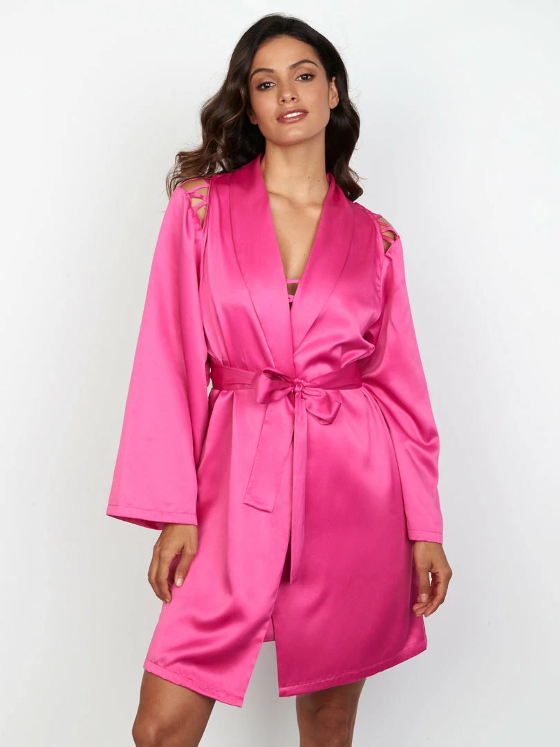 Alluring and sophisticated, the Summer Lace Robe from Frederick’s of Hollywood is the perfect addition to your loungewear collection. This sleep set is crafted with the softest satin and is designed with a fashion forward cross-over strap shoulder detail, provocatively revealing your skin beneath. Crafted with a double-faced satin ribbon designed to be worn tied at the waist or worn open. Pair with the Summer Lattice Lacing Babydoll or Sleep Set to complete the look.